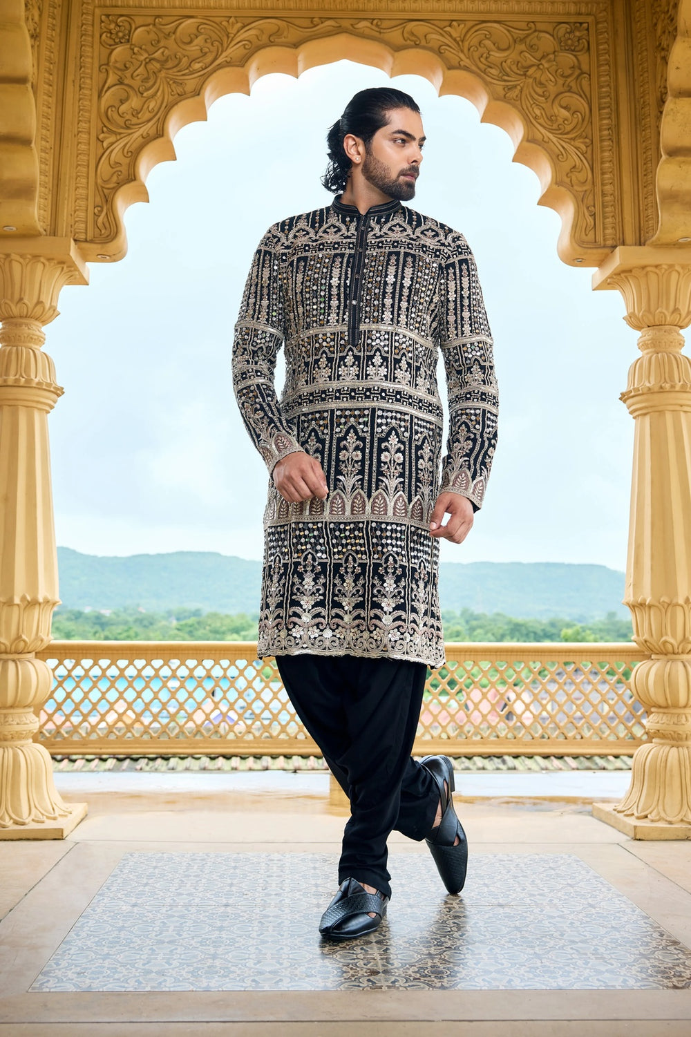 Turn heads with this black royal kurta set, intricately handcrafted with mirror embellishments and rich gold zari embroidery. The fusion of reflective mirror work with shimmering gold detailing creates a grand Mughal-inspired design, making this outfit a true statement of luxury and elegance.Paired with a black dhoti-style salwar, this kurta is the perfect choice for wedding receptions, sangeet nights, and high-end festive occasions. Designed for grooms and wedding guests who want to showcase heritage artistry with bold sophistication, this ensemble defines modern royalty.
