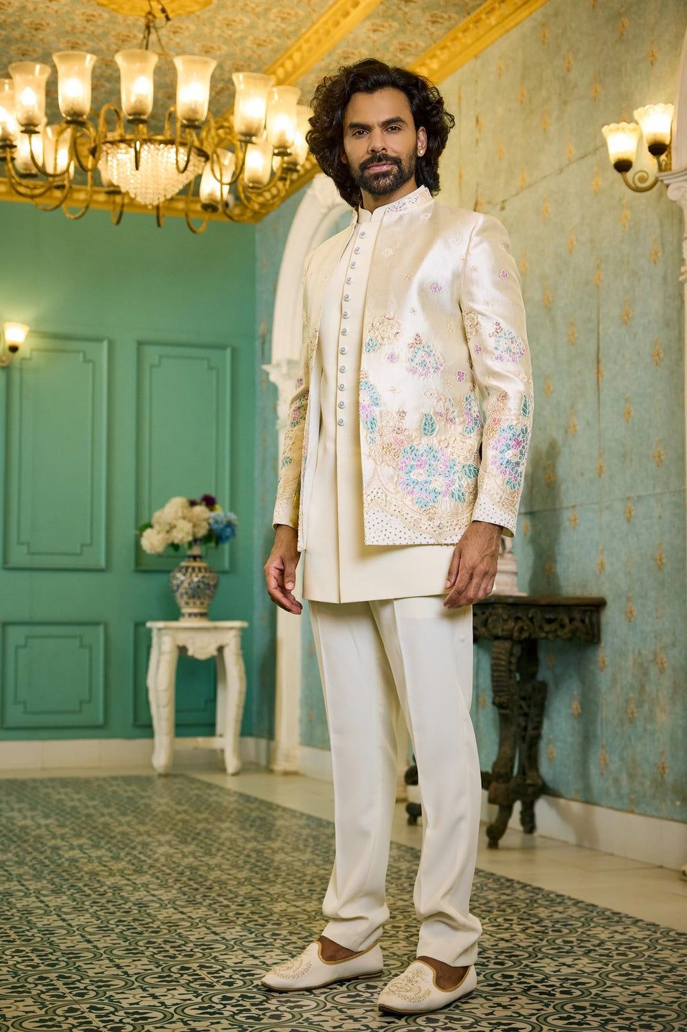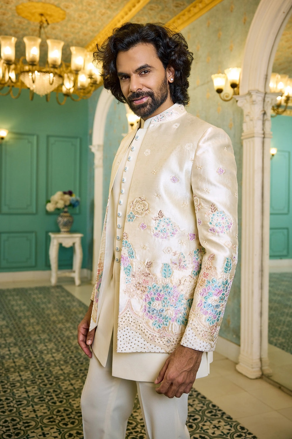 Step into elegance with the Cream Floréal Open Indo-Western, crafted on a refined cream base and elevated with pastel multicolour floral hand embroidery. The open-front jacket silhouette adds a modern couture appeal, while the detailed floral motifs bring a touch of timeless artistry.