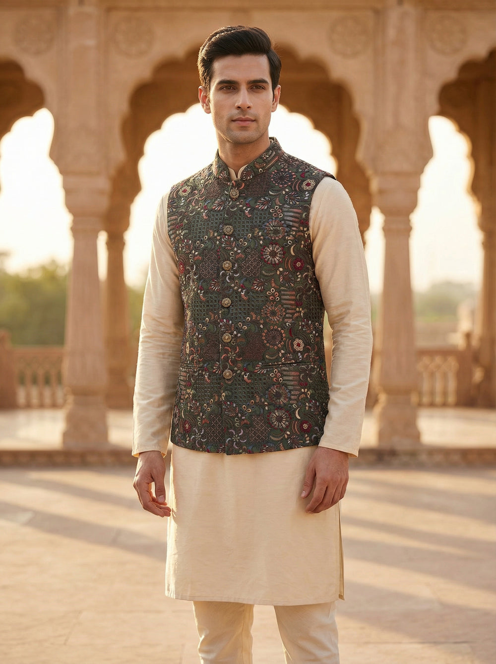 Elevate your ethnic wardrobe with this Dark Green Multicolor Woven Nehru Koti for Men from Mahavir NX, crafted for men who appreciate refined tradition with a modern edge. Featuring intricate multicolor woven patterns on a rich dark green base, this Nehru koti adds depth and elegance to any festive or ceremonial look. Made from premium-quality fabric, it offers a comfortable fit while ensuring a sharp, structured silhouette. Perfect to layer over a kurta for weddings, festivals, engagements, or cultural celebrations, this woven Nehru koti blends timeless Indian craftsmanship with contemporary style. Pair it with ivory or beige kurtas and classic footwear to create a distinguished ensemble that stands out effortlessly. Designed for durability, style, and versatility, this piece is a must-have for men who want to make a confident ethnic statement with ease.
