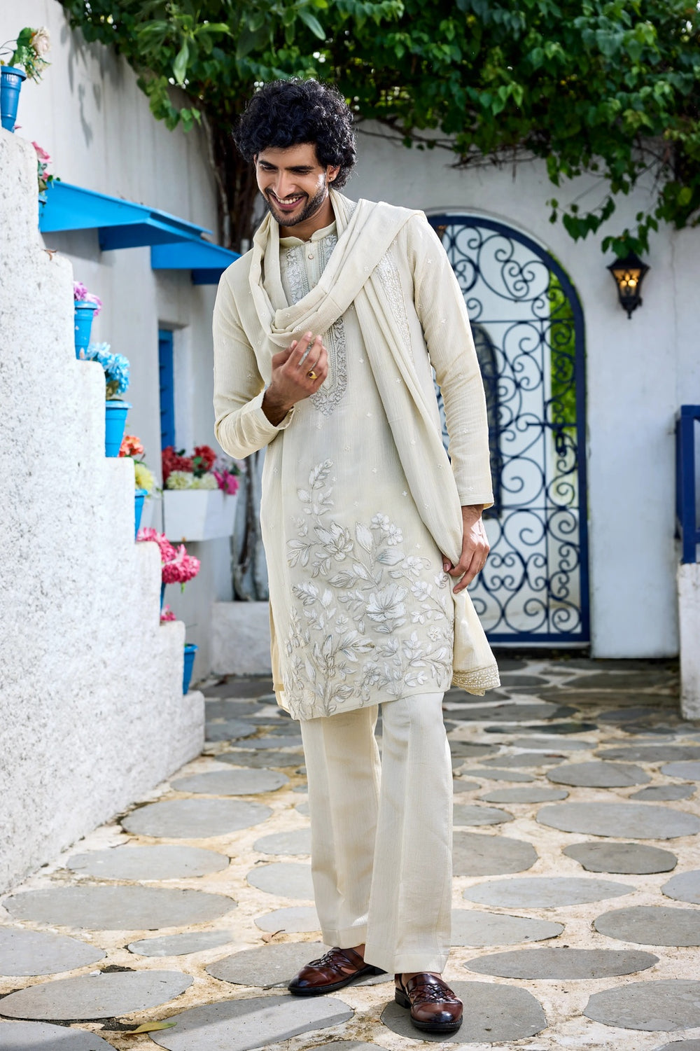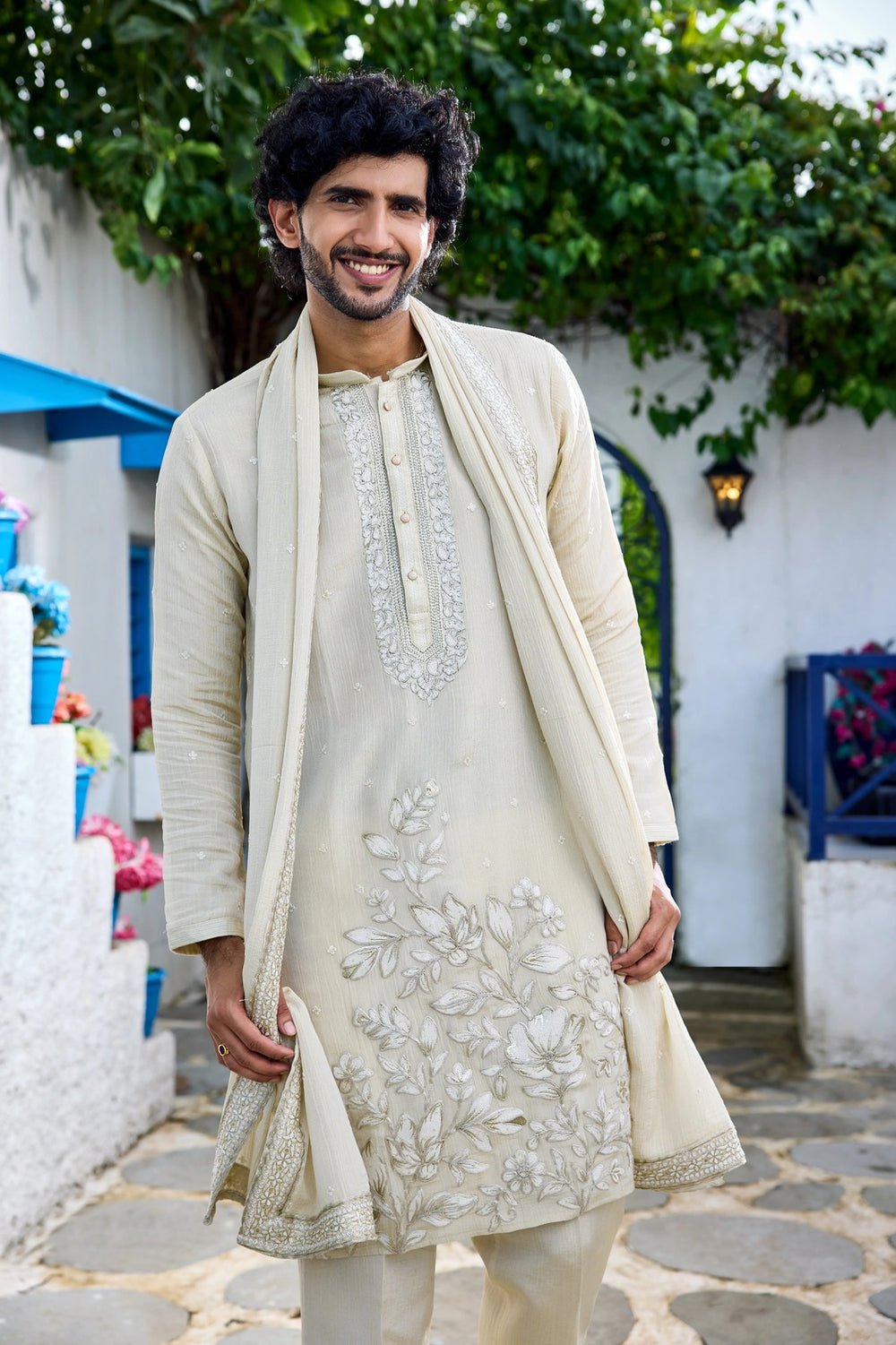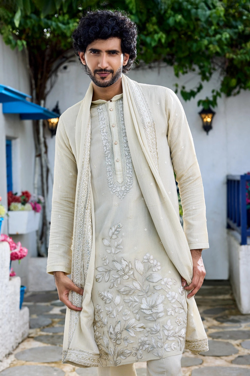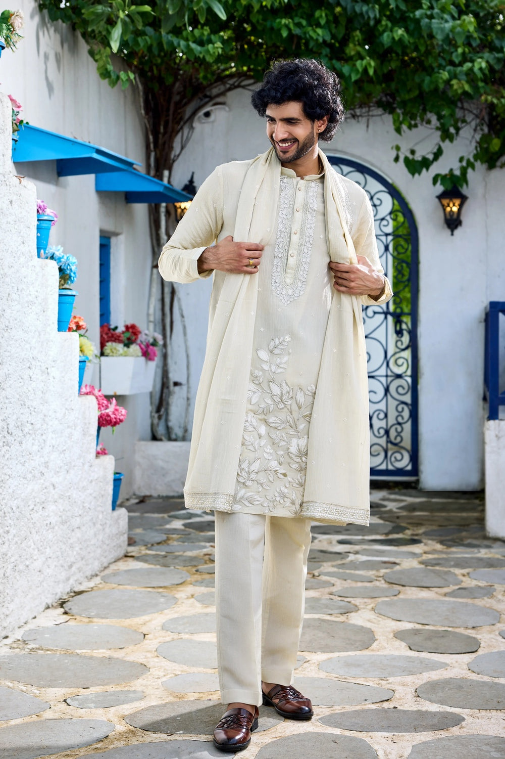 Step into timeless elegance with the Ivory Floral Embroidered Kurta Set with Dupatta, crafted in a regal ivory base and enriched with tonal floral embroidery. The outfit is paired with a matching churidar and a finely detailed dupatta, adding a touch of sophistication and grace.