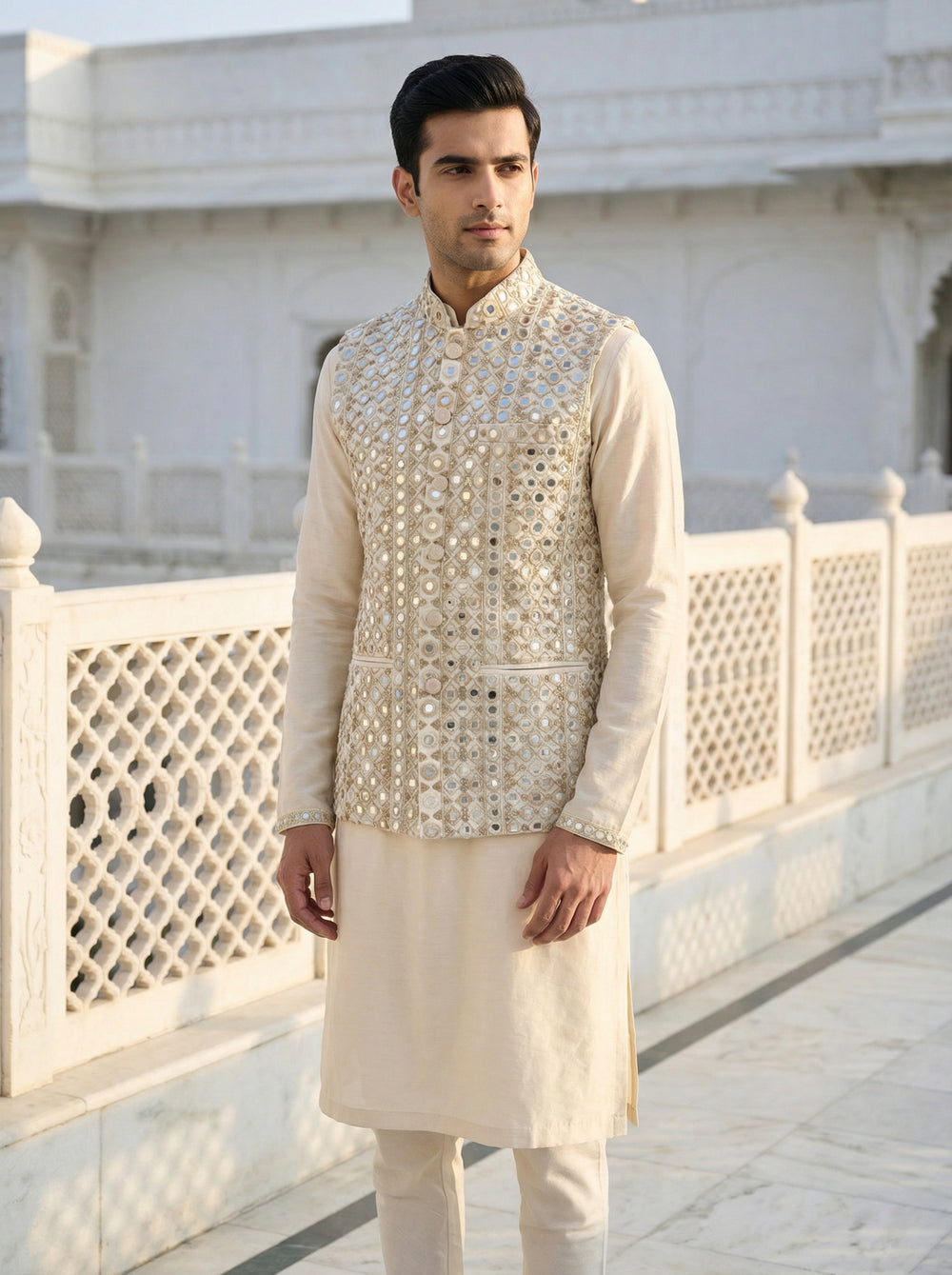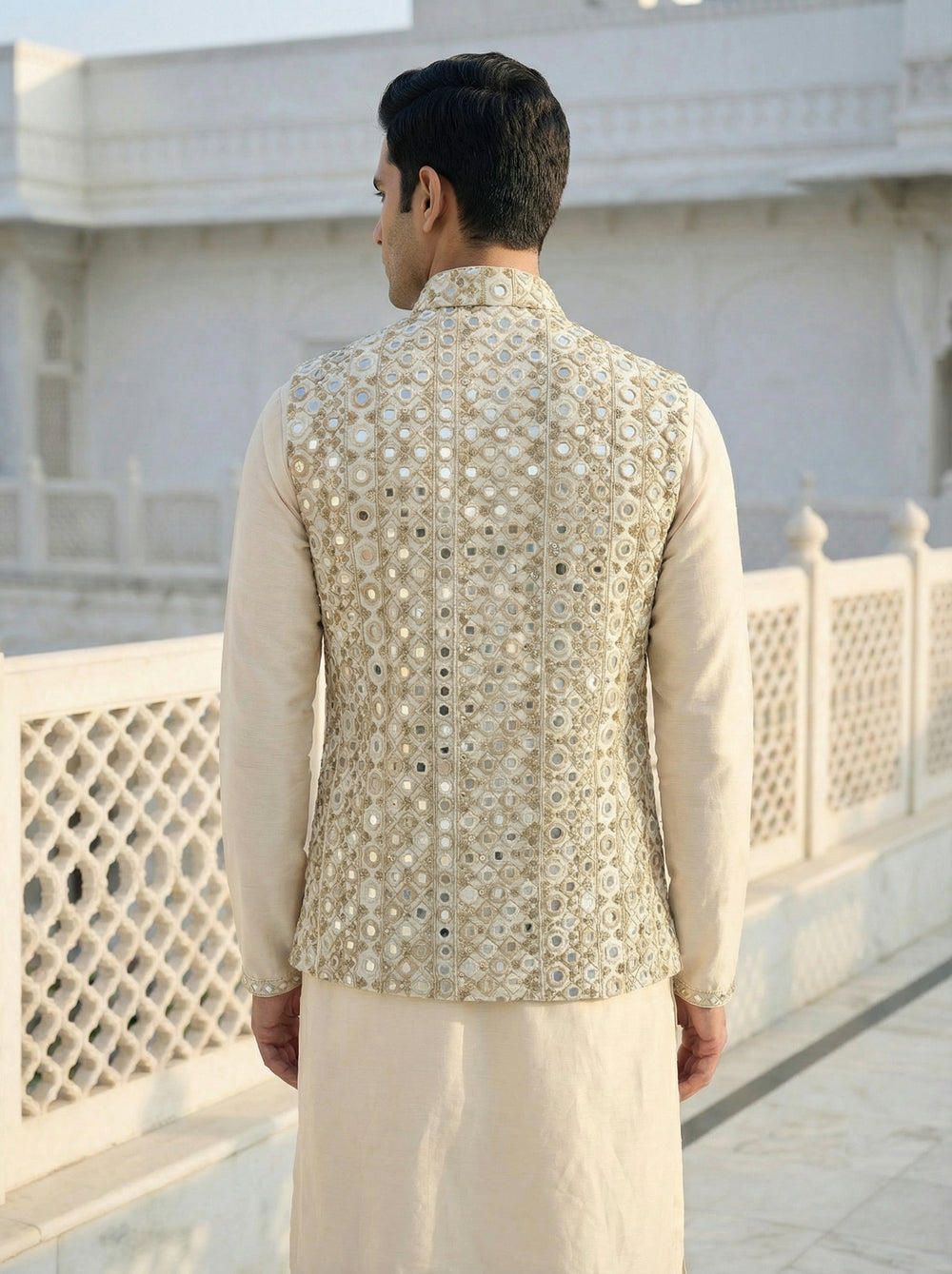 Designer Nehru Koti for Men / Ethnic Nehru Koti Ivory / Festive Nehru Jacket Men / Handcrafted Mirror Work Jacket / Indian Traditional Menswear / Indian Wedding Nehru Koti / Ivory Mirror Work Nehru Koti for Men / Ivory Nehru Jacket Mens / Kurta Jacket Nehru Koti / Mahavir NX Nehru Koti / Men’s Ethnic Waistcoat Ivory / Mirror Work Nehru Koti / Party Wear Nehru Koti / Premium Ethnic Wear for Men / Royal Nehru Jacket for Men / Traditional Nehru Koti India / Wedding Nehru Koti for Groom / Wedding Waistcoat for Men