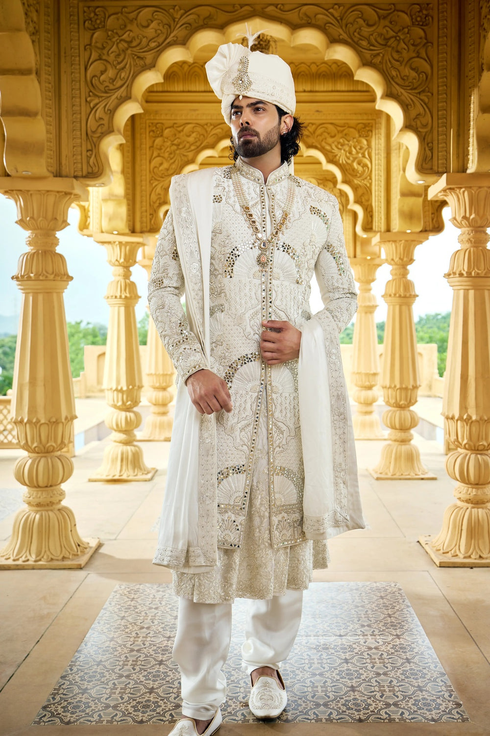 Experience true grandeur with this ivory anarkali-style sherwani, crafted with textured embroidery and intricate mirror handwork that reflects pure luxury. This regal piece is designed for grooms who wish to look majestic while blending heritage elegance with contemporary style.The sherwani comes complete with an embroidered dupatta, matching belt, churidar bottoms, and layered accessories, creating a perfect royal ensemble. The mirror detailing catches light beautifully, ensuring a radiant presence throughout your wedding celebrations.An ideal choice for weddings, palace ceremonies, and opulent receptions, this sherwani is a statement of tradition, elegance, and luxury.