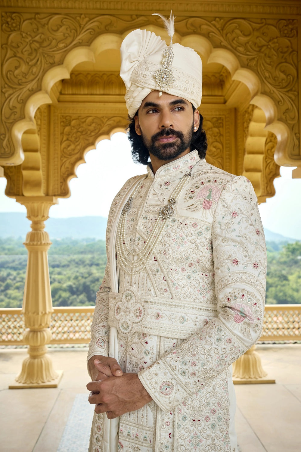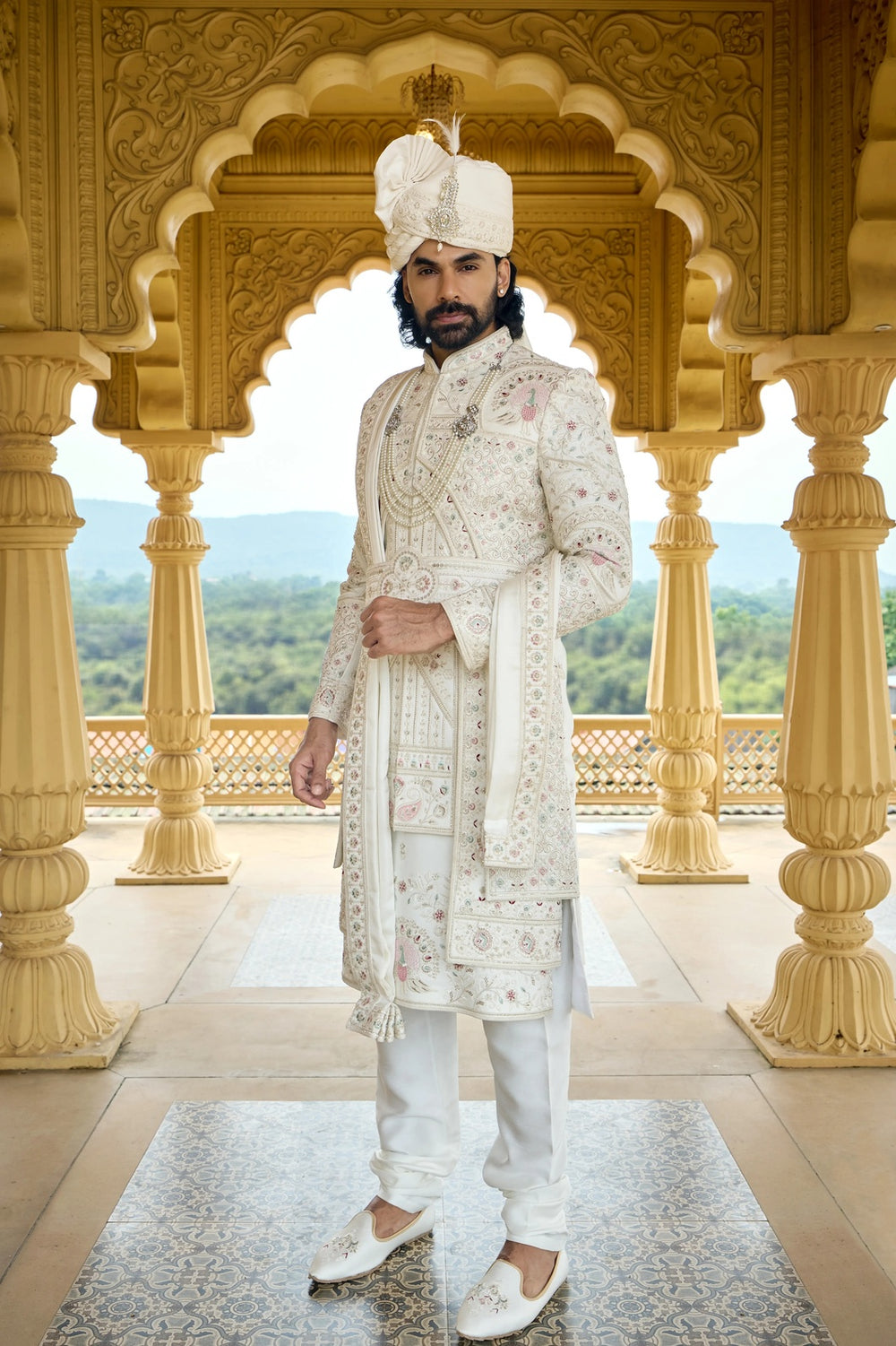 Step into your big day with grandeur in this ivory groom’s sherwani, adorned with delicate pastel embroidery and textured detailing. Designed with a royal turban, embroidered dupatta, matching belt, churidar bottoms, and pearl mala accessories, this ensemble captures the perfect balance of heritage craftsmanship and modern elegance.The pastel thread embroidery on the ivory base adds subtle richness, while the belted dupatta design elevates the groom’s royal presence. Ideal for palace weddings, luxury receptions, and traditional ceremonies, this sherwani is crafted for grooms who want to look regal yet refined.
