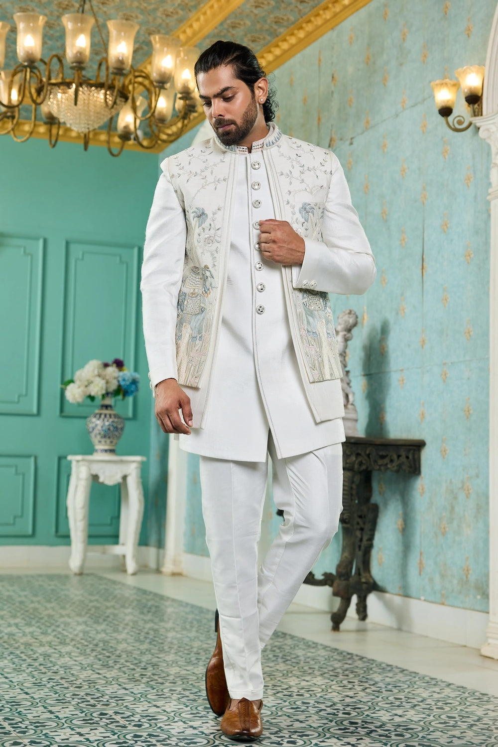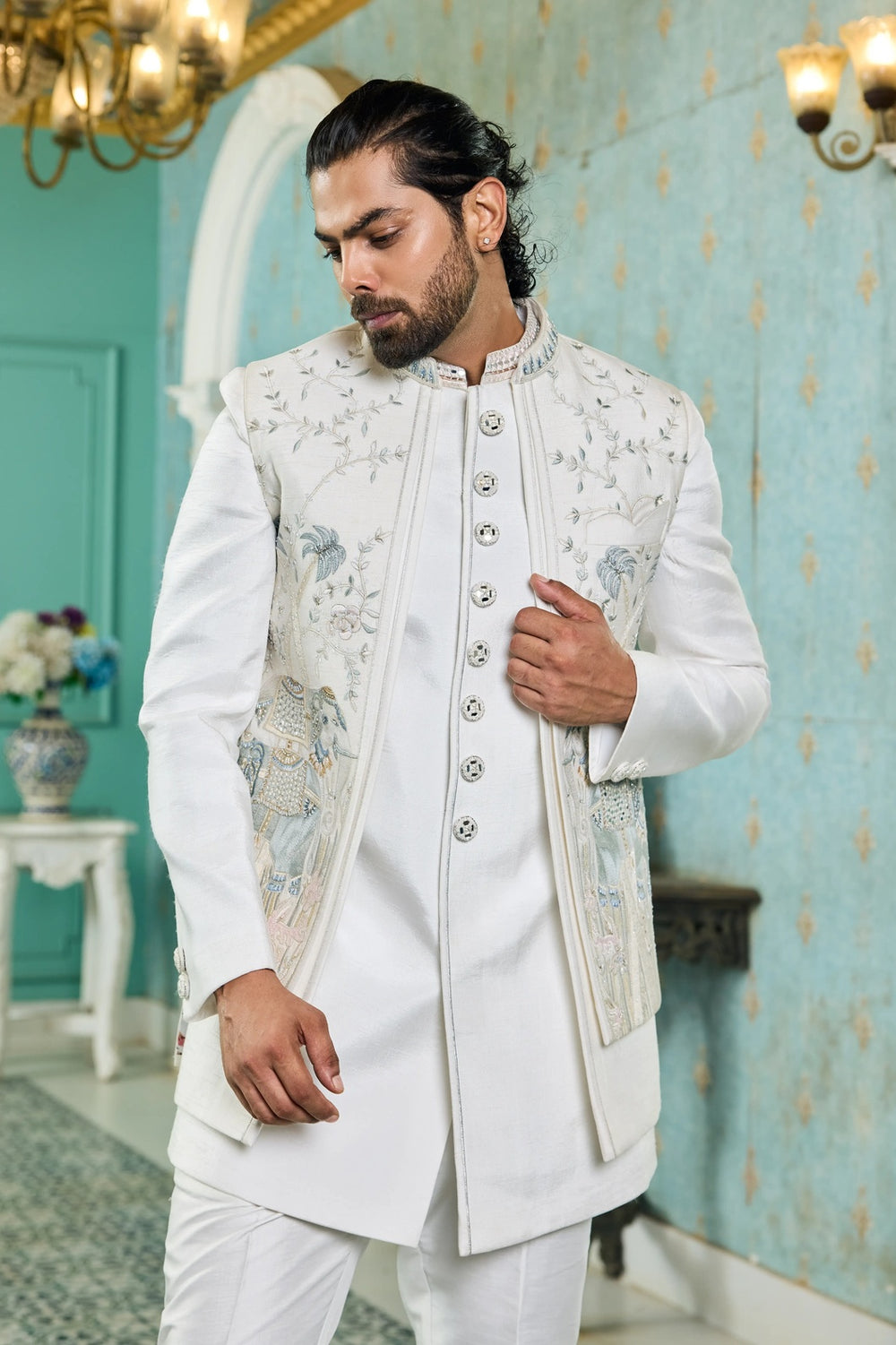 Embrace subtle grandeur with the Ivory Pastel Handwork Indo-Western, designed on a pristine ivory base and finished with a long jacket intricately detailed in pastel hand embroidery. The artisanal pastel work adds depth, sophistication, and a touch of modern freshness to this timeless silhouette.