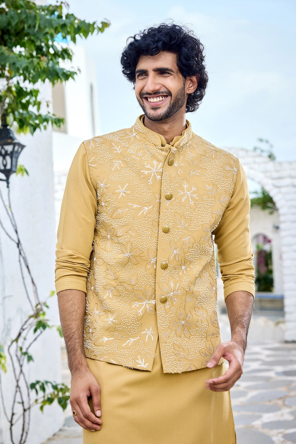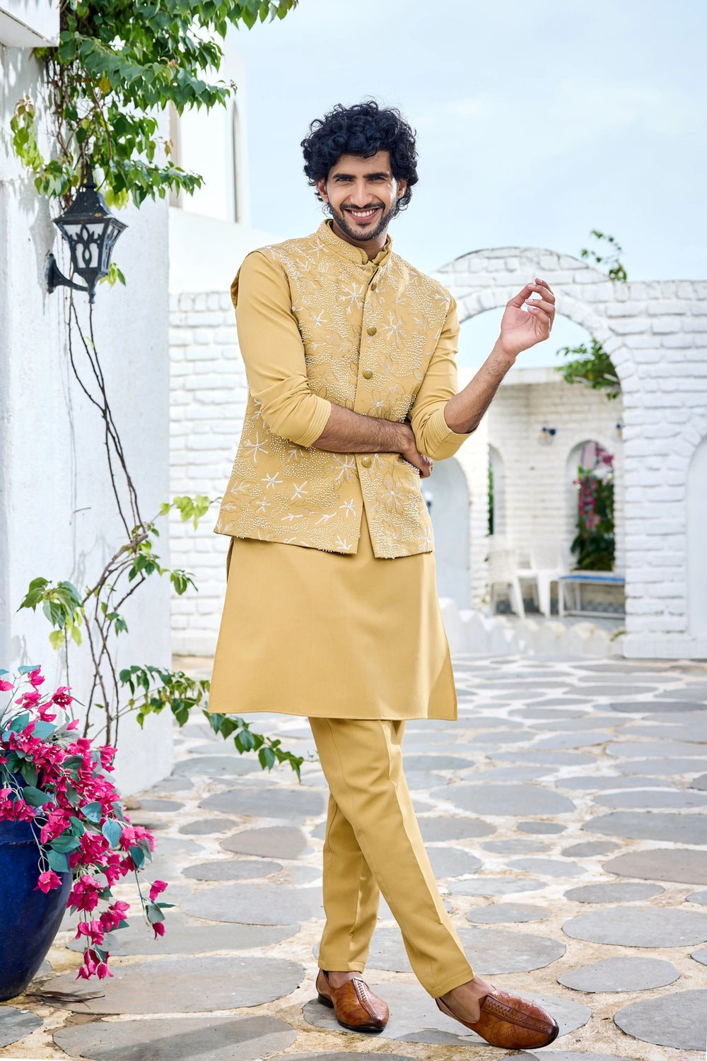 Add a touch of regal elegance to your wardrobe with this Mustard Embroidered Jacket Kurta Set. The solid mustard kurta-pajama is paired with a beautifully embroidered Nehru jacket, featuring delicate threadwork in contrasting tones that highlight the rich mustard base.