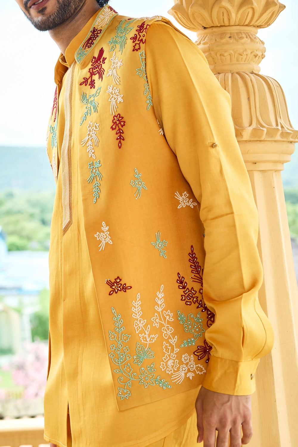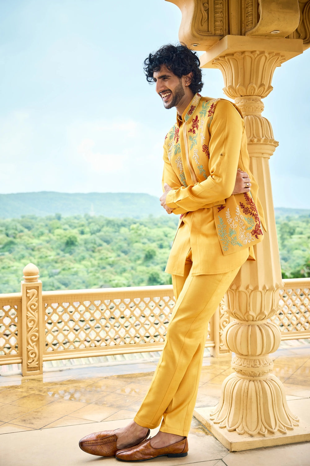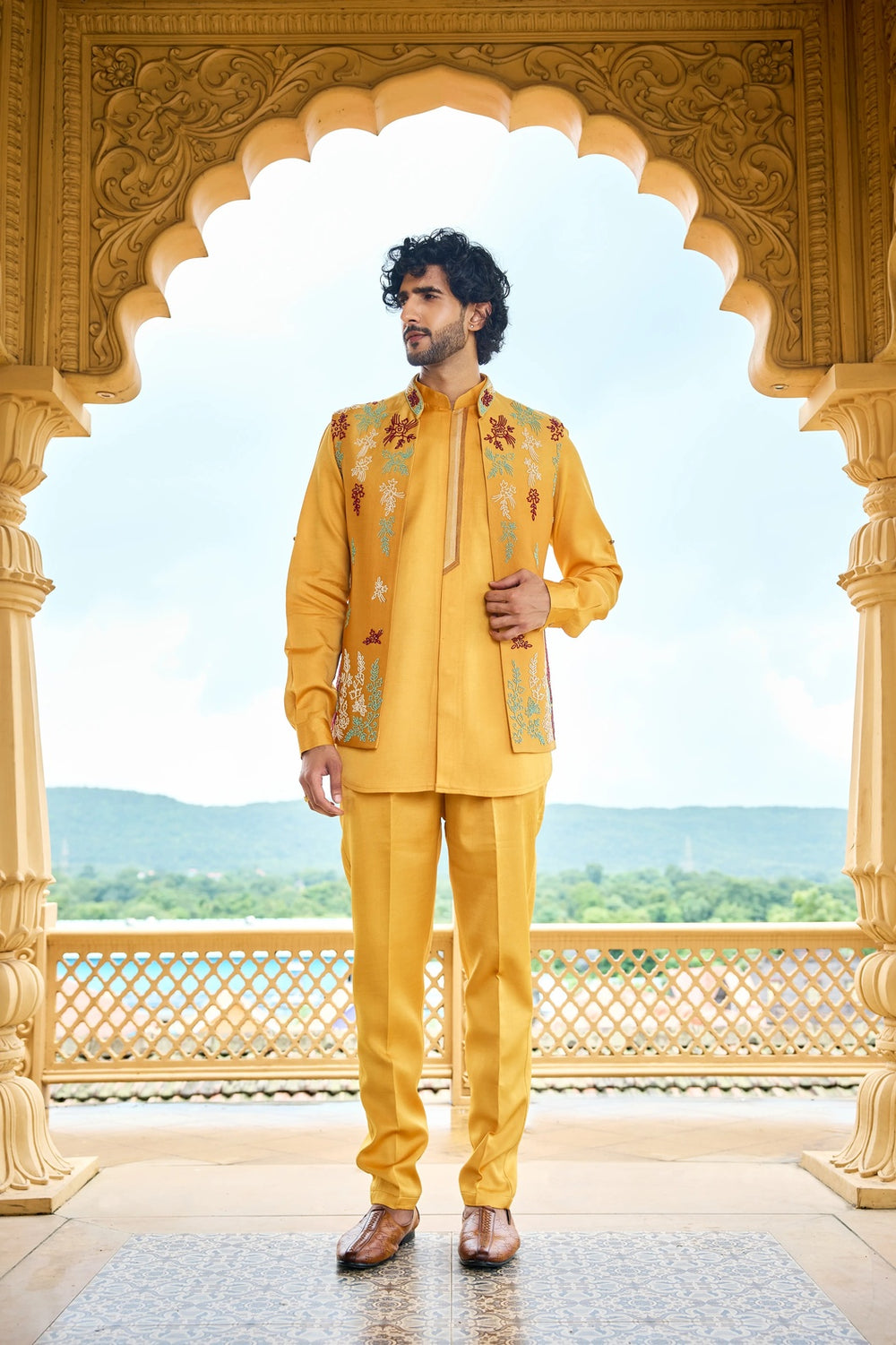 Add sunshine to your celebrations with this mustard yellow kurta set, styled with a short embroidered jacket featuring multicolor floral handwork. The vibrant yellow tone makes it an ideal outfit for Haldi, Mehendi, festive gatherings, and daytime wedding events.Paired with straight-cut trousers and finished with modern tailoring, this ensemble blends traditional embroidery with a contemporary silhouette, making it a standout festive pick for grooms, groomsmen, and wedding guests.