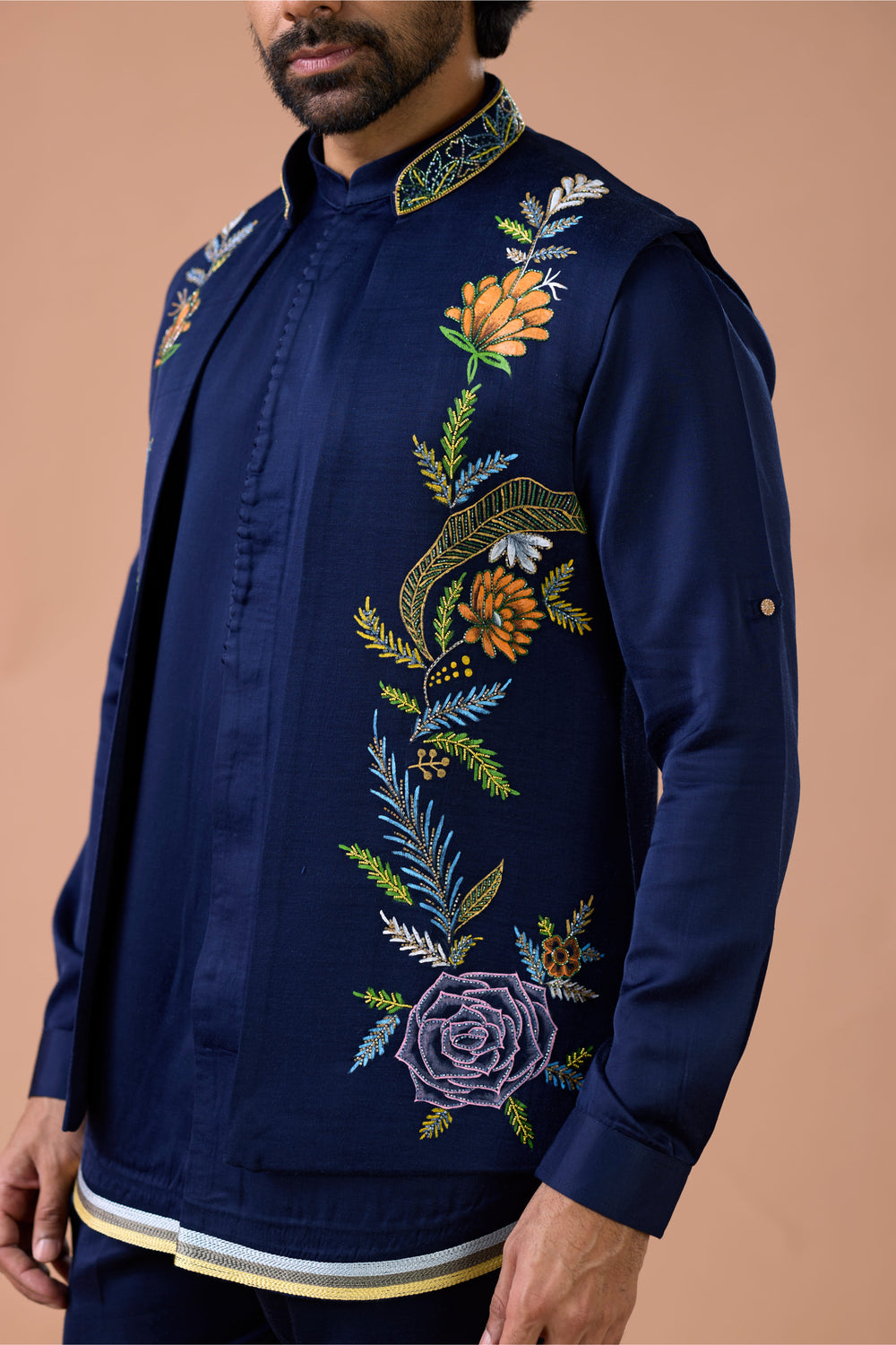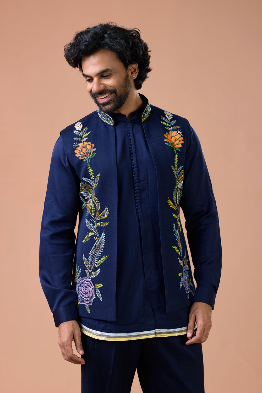 Upgrade your festive wardrobe with the Navy Blue Floral Embroidered Sangeet Jacket Kurta for Men from Mahavir NX. This premium kurta set features a finely crafted Nehru jacket with intricate floral embroidery, paired with a comfortable kurta—perfect for weddings, sangeet ceremonies, and special occasions. Made with high-quality fabric, it ensures both style and comfort all day long. Stand out with a blend of traditional charm and modern elegance that leaves a lasting impression. Shop now at Mahavir NX and celebrate every moment in style!