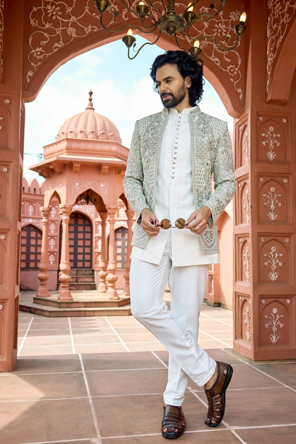 Fresh, refined, and effortlessly stylish, this Pista Green Embroidered Indo-Western is crafted for modern celebrations. The pista green kurta set is elevated with a beautifully embroidered jacket showcasing delicate threadwork and subtle embellishments. Its soothing pastel tone makes it a standout choice for daytime weddings, mehendi ceremonies, and festive occasions.