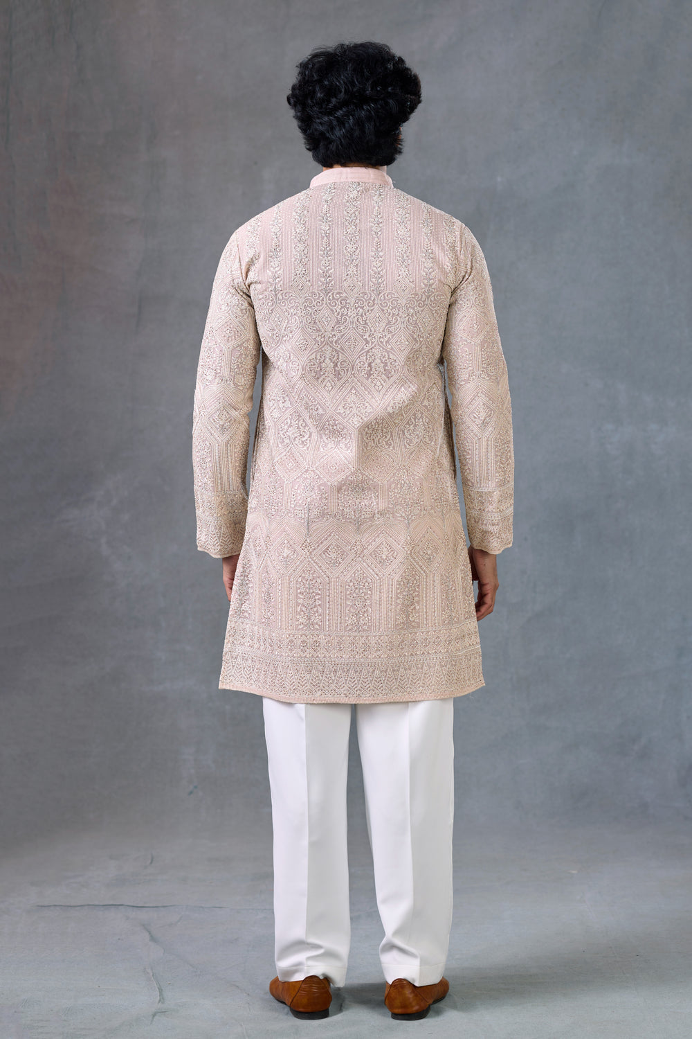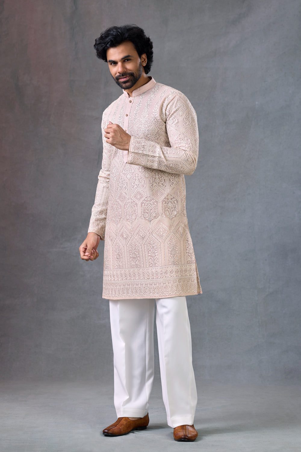 Designer casual kurta for men / Indian wedding kurta for men / Ivory wedding kurta for men / Lightweight summer kurta / Men’s ethnic wedding outfit / Men’s festive wear summer / Men’s kurta with straight pants / Stylish ivory kurta for men / Summer wedding kurta set / Traditional kurta set for men / Wedding kurta for groom