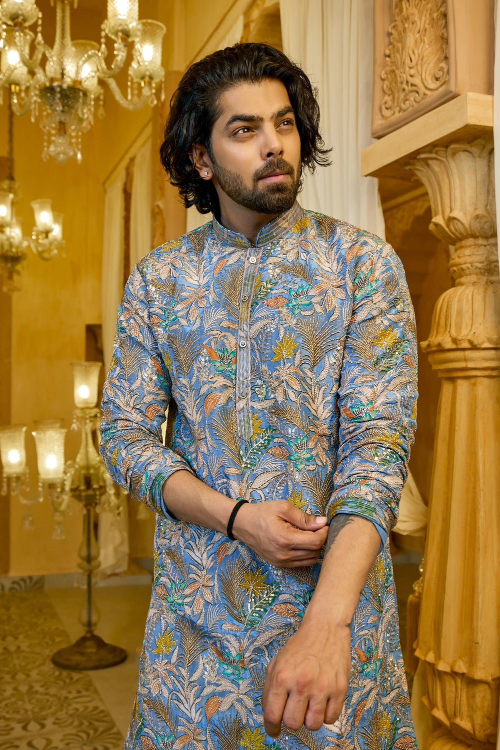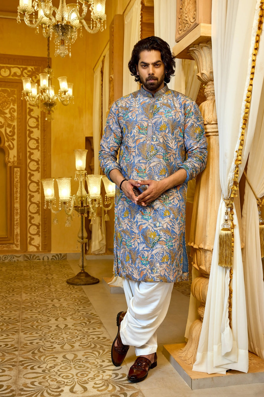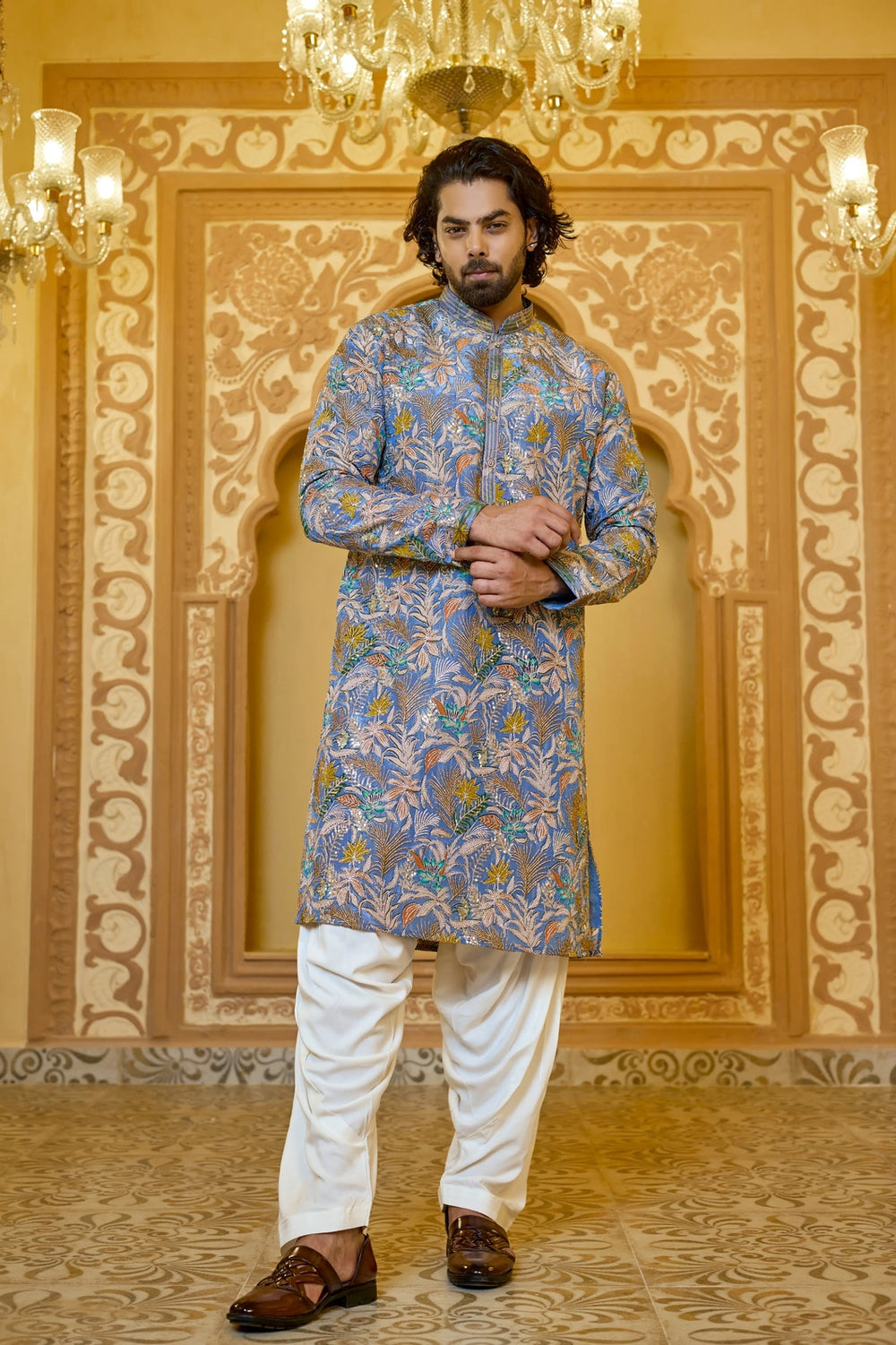 Step into timeless elegance with this royal blue kurta for men, beautifully adorned with intricate multicolor floral thread embroidery. Crafted with premium fabric and fine hand detailing, this designer kurta brings together traditional artistry and modern sophistication.Paired with a classic white churidar, this kurta is the perfect choice for weddings, receptions, festive gatherings, and cultural celebrations. With its rich colour palette and exquisite embroidery, it’s designed for men who wish to stand out in refined ethnic style.
