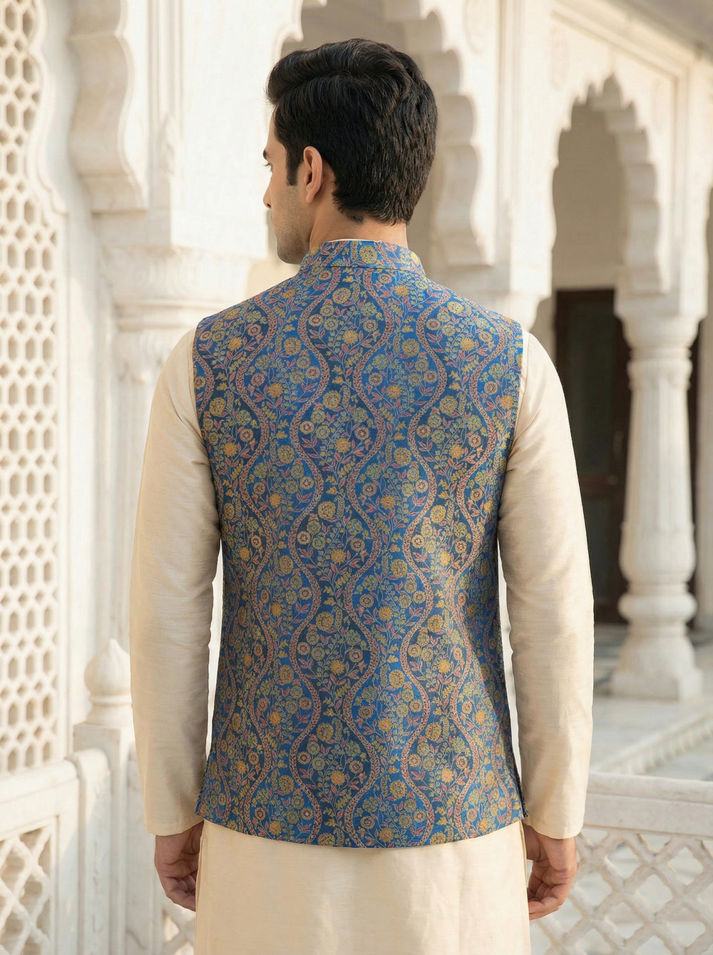 Royal Blue Floral Print Nehru Koti for Men from Mahavir NX is a statement of refined tradition blended with modern elegance. Designed in a rich royal blue base with intricate floral prints, this Nehru koti adds instant sophistication to any ethnic look. Crafted from premium fabric, it offers a comfortable fit while maintaining a sharp, structured silhouette. Perfect for weddings, festive occasions, receptions, and cultural celebrations, this koti pairs effortlessly with kurtas, shirts, and churidars. The elegant mandarin collar and detailed finish reflect superior craftsmanship and timeless Indian style. Elevate your ethnic wardrobe with this versatile piece that delivers luxury, comfort, and standout appeal ideal for men who prefer classic fashion with a contemporary touch. Shop this exclusive design only at Mahavir NX, where tradition meets trend.