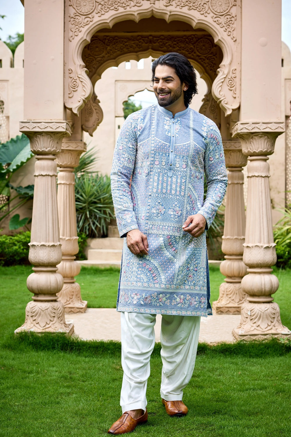 Bring a refreshing charm to your celebrations with the Sky Blue Pastel Floral Kurta Set, designed in a soft sky-blue base and embellished with delicate pastel multicolour floral hand embroidery. The intricate detailing reflects heritage craftsmanship with a modern pastel twist, making it a standout festive outfit.
