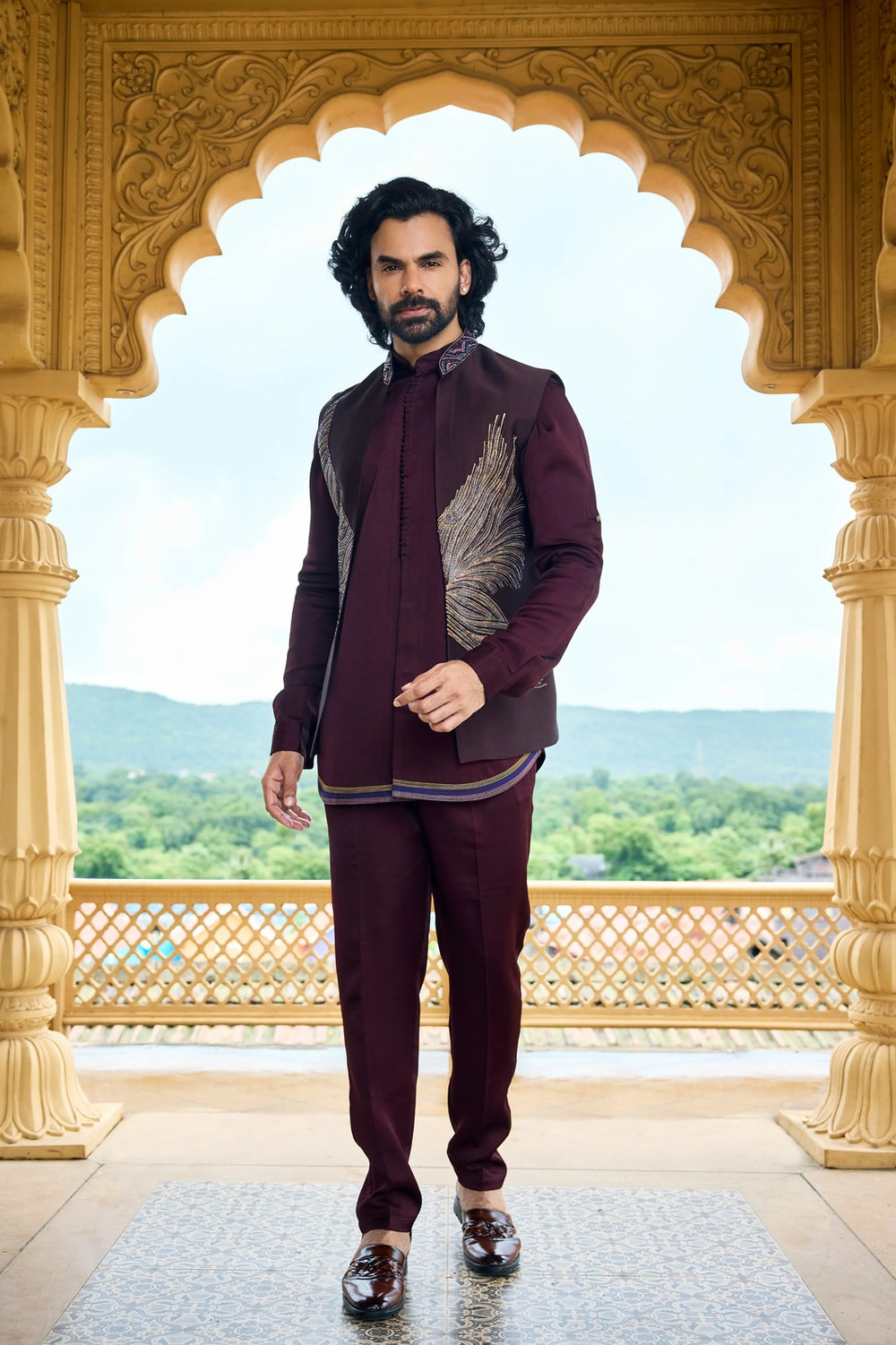 Command attention with this deep wine Indo-Western set, featuring a short open jacket beautifully hand-embroidered with a multicolor eagle motif at the center. The eagle, symbolizing power and prestige, is highlighted with intricate threadwork and metallic detailing, making it the signature element of this luxury outfit.Paired with a matching kurta and slim trousers, this ensemble blends traditional craftsmanship with contemporary tailoring, making it perfect for cocktail parties, sangeet nights, receptions, and wedding festivities. Designed for men who want to make a bold, regal, and stylish statement.