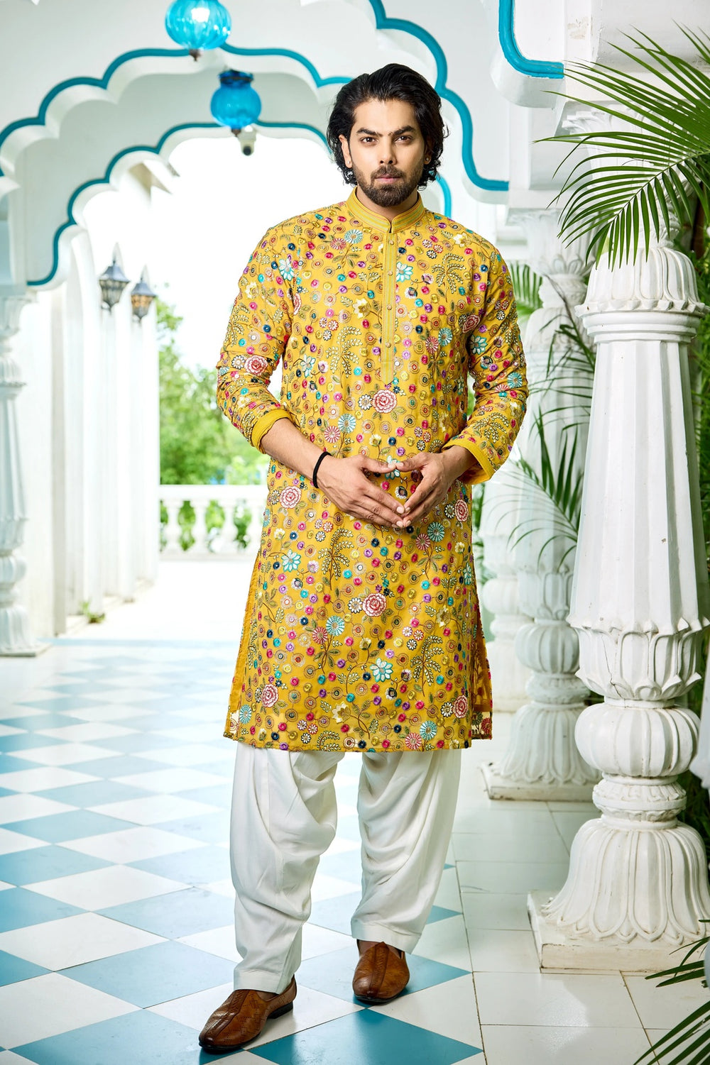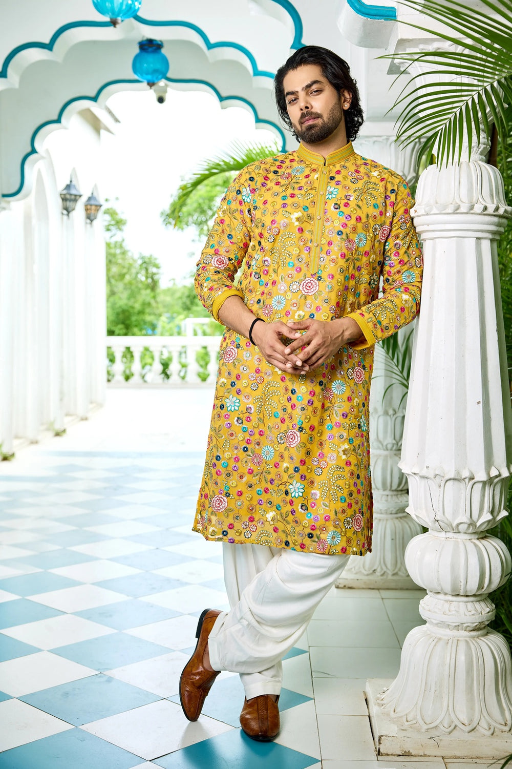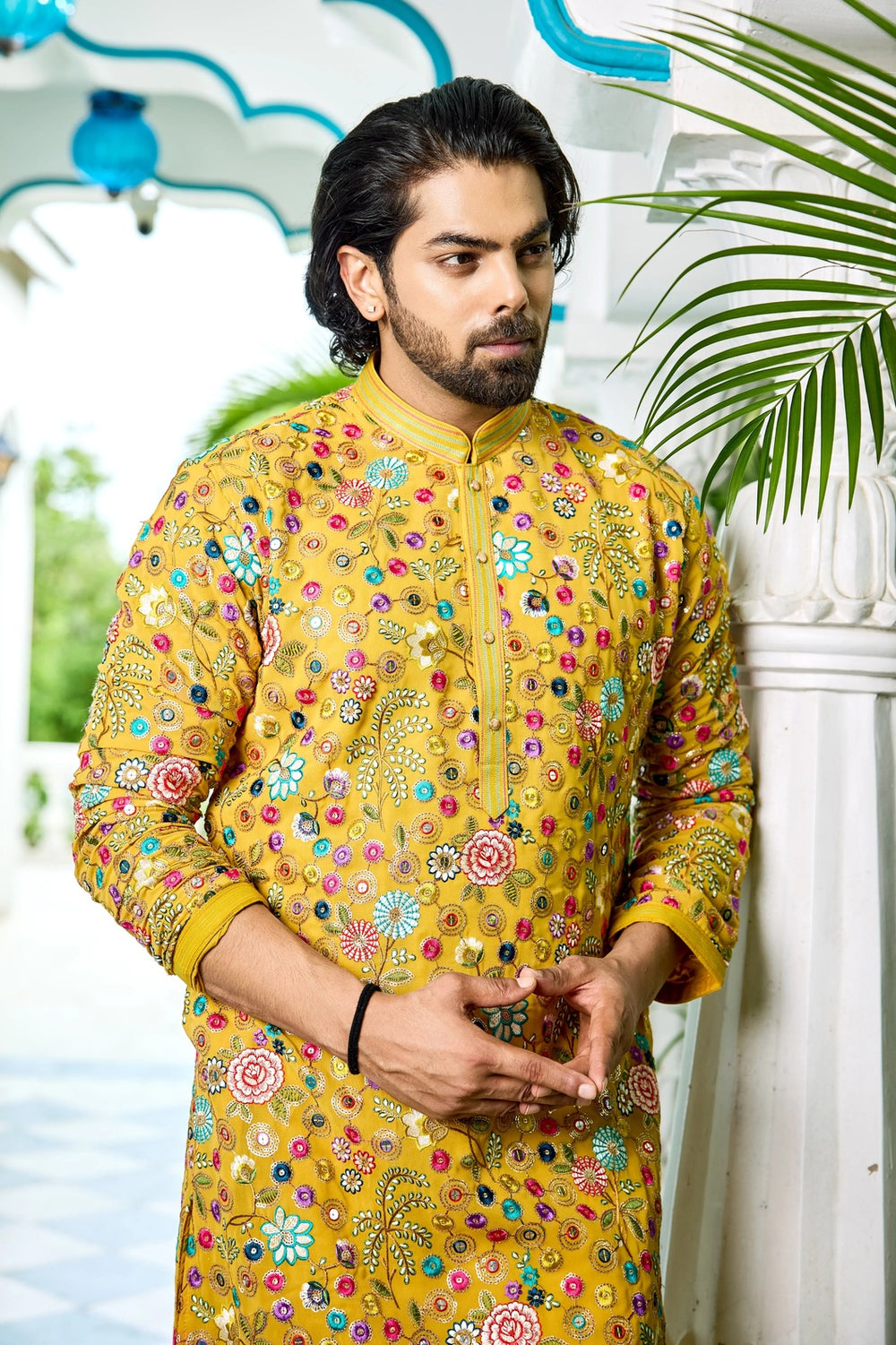 Brighten your celebrations with the Yellow Floral Multicolour Kurta Set, crafted on a vibrant yellow base and embellished with intricate multicolour floral hand embroidery and mirror highlights. The colourful detailing creates a festive, royal appeal, making this kurta perfect for standout occasions.