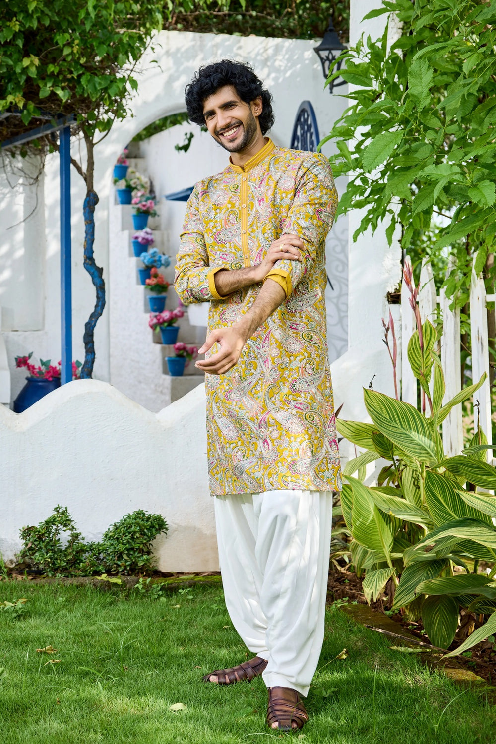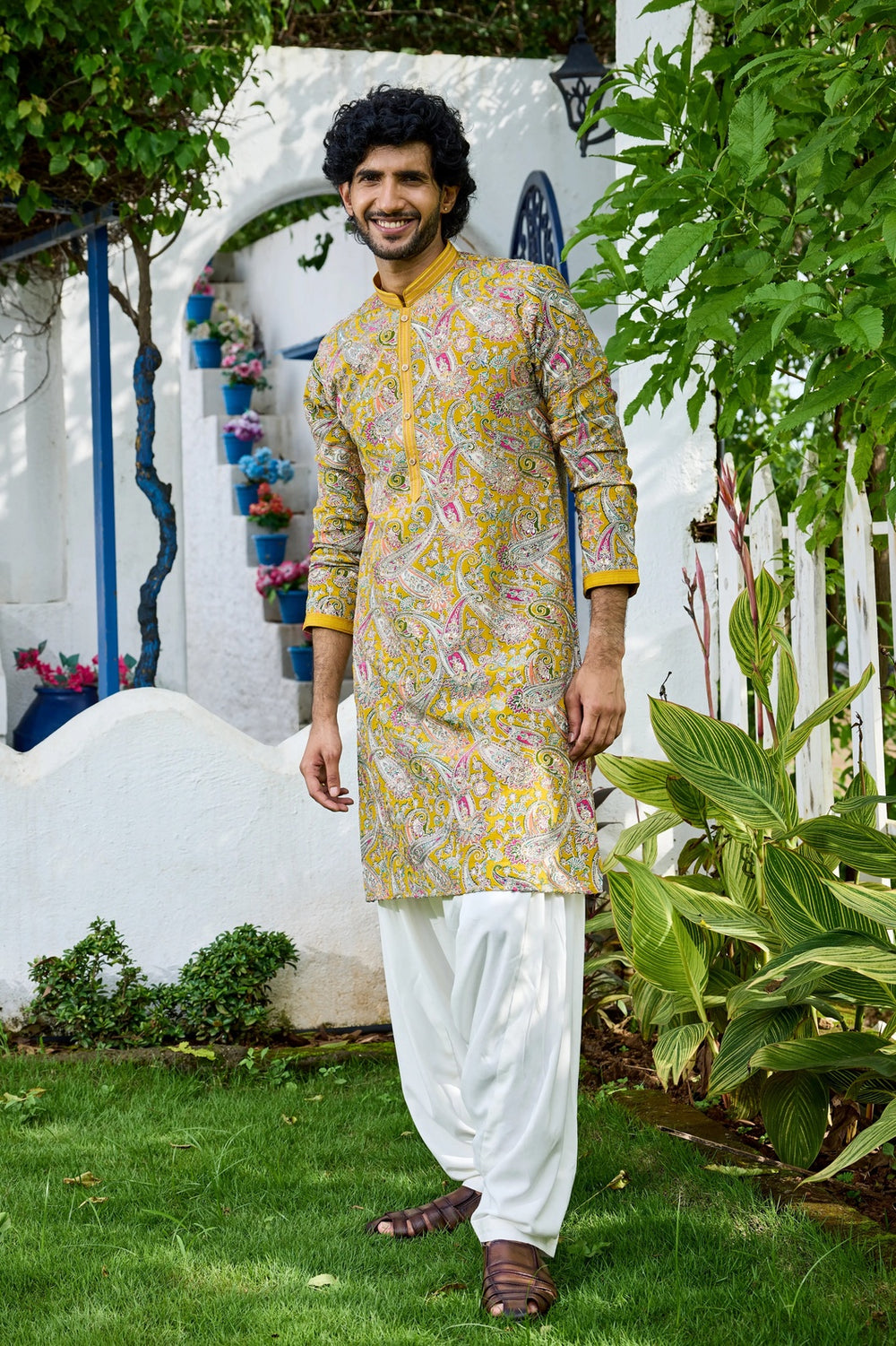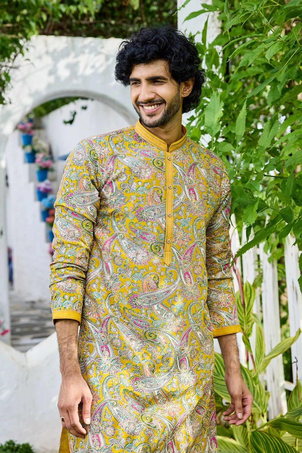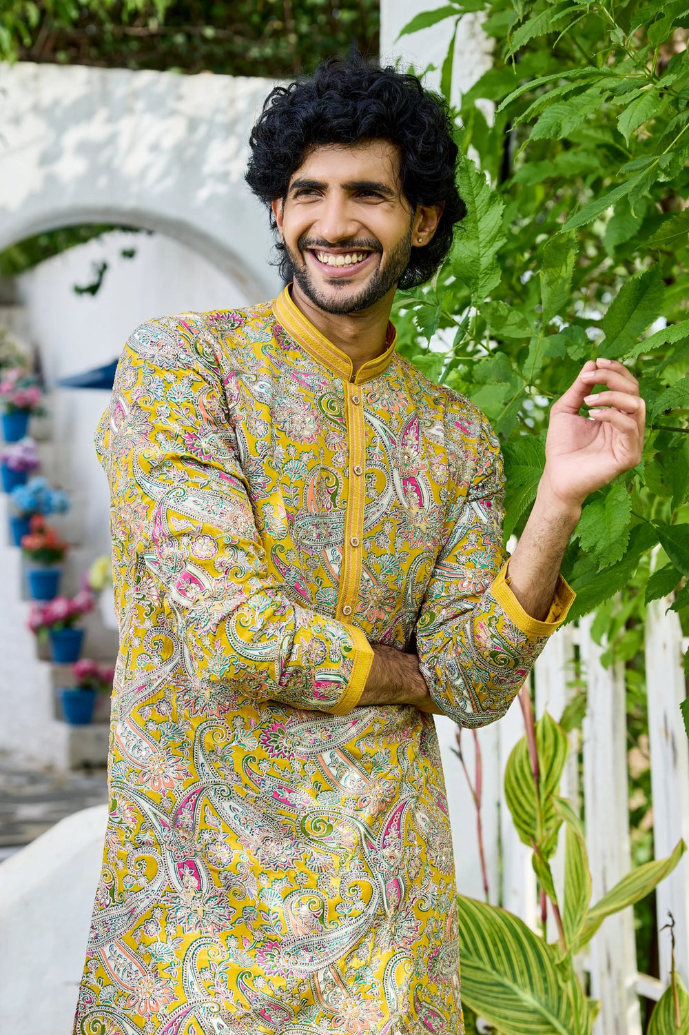 Embrace timeless tradition with the Yellow Paisley Embroidered Kurta, designed on a vibrant yellow base and adorned with intricate multicolour paisley embroidery in pink, silver, and grey hues. The rich patterns reflect heritage artistry, making this kurta a standout festive choice.